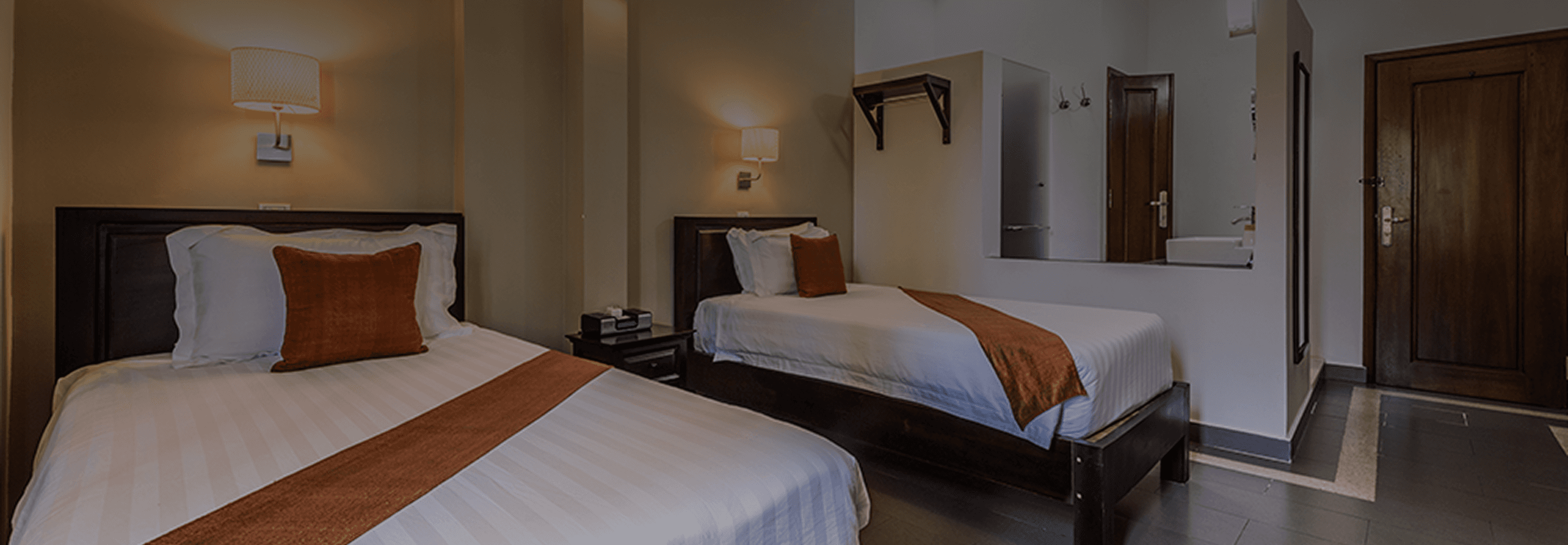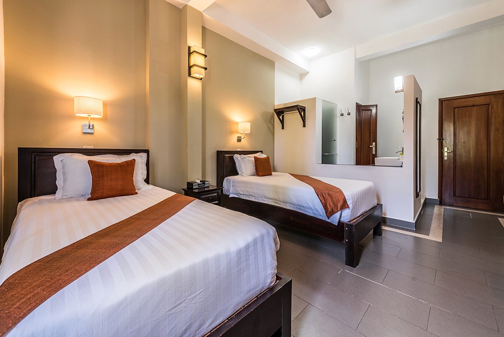 Our Deluxe Twin Room combines colonial charm and modern comfort, featuring Cambodian and art deco accents, air conditioning. Rates include both breakfast and complimentary WiFi.