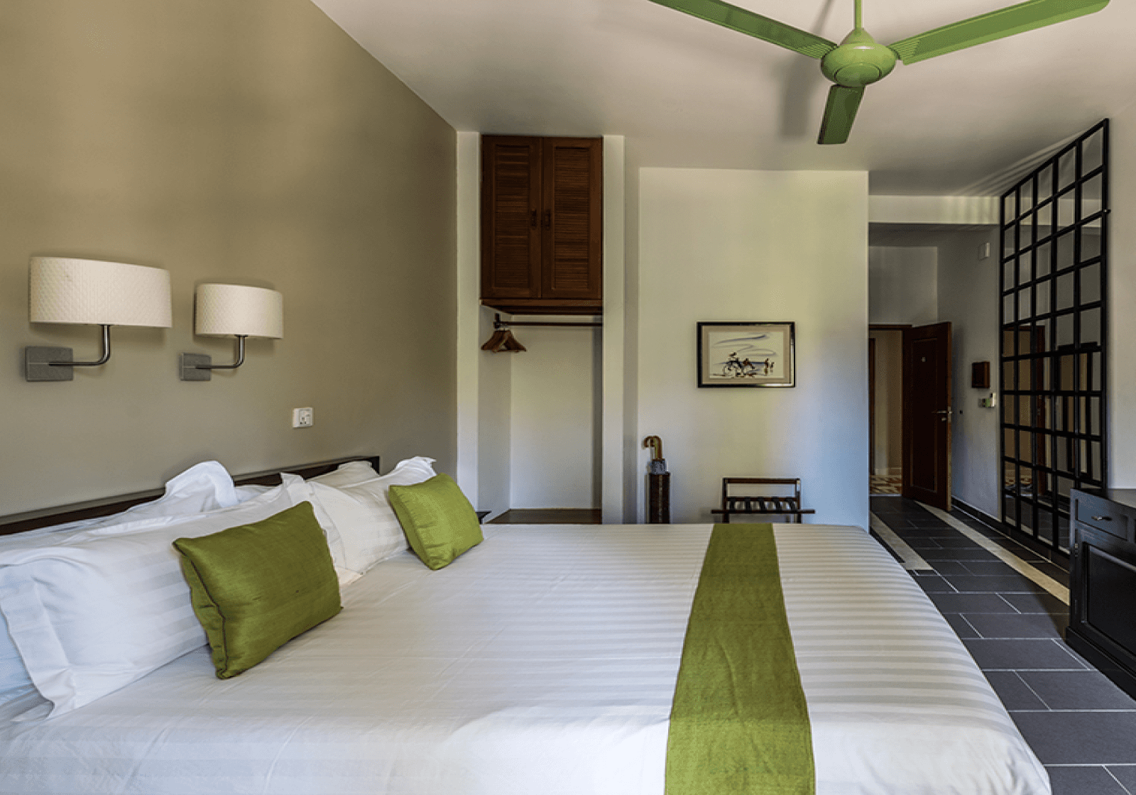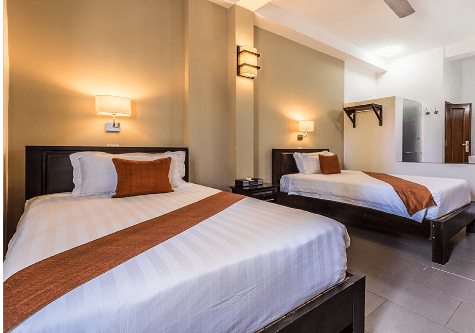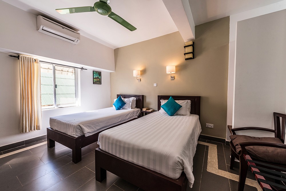 Our Deluxe Twin Room combines colonial charm and modern comfort, featuring Cambodian and art deco accents, air conditioning. Rates include both breakfast and complimentary WiFi.